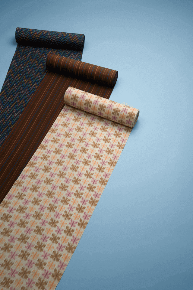 Tamaori, the collective name of five different textiles depending on the weaving technique, originating in Hachioji, in Southwest Tokyo Prefecture; Tamaori includes “Tamayuki”, “Futsuori”, “Tsumugiori”, “Mojiriori” and “Tsuzure.” Tamaori, is made of silk thread and features intricate geometric patterns, all produced by hand producing a lightweight and wrinkle-resistant fabric.